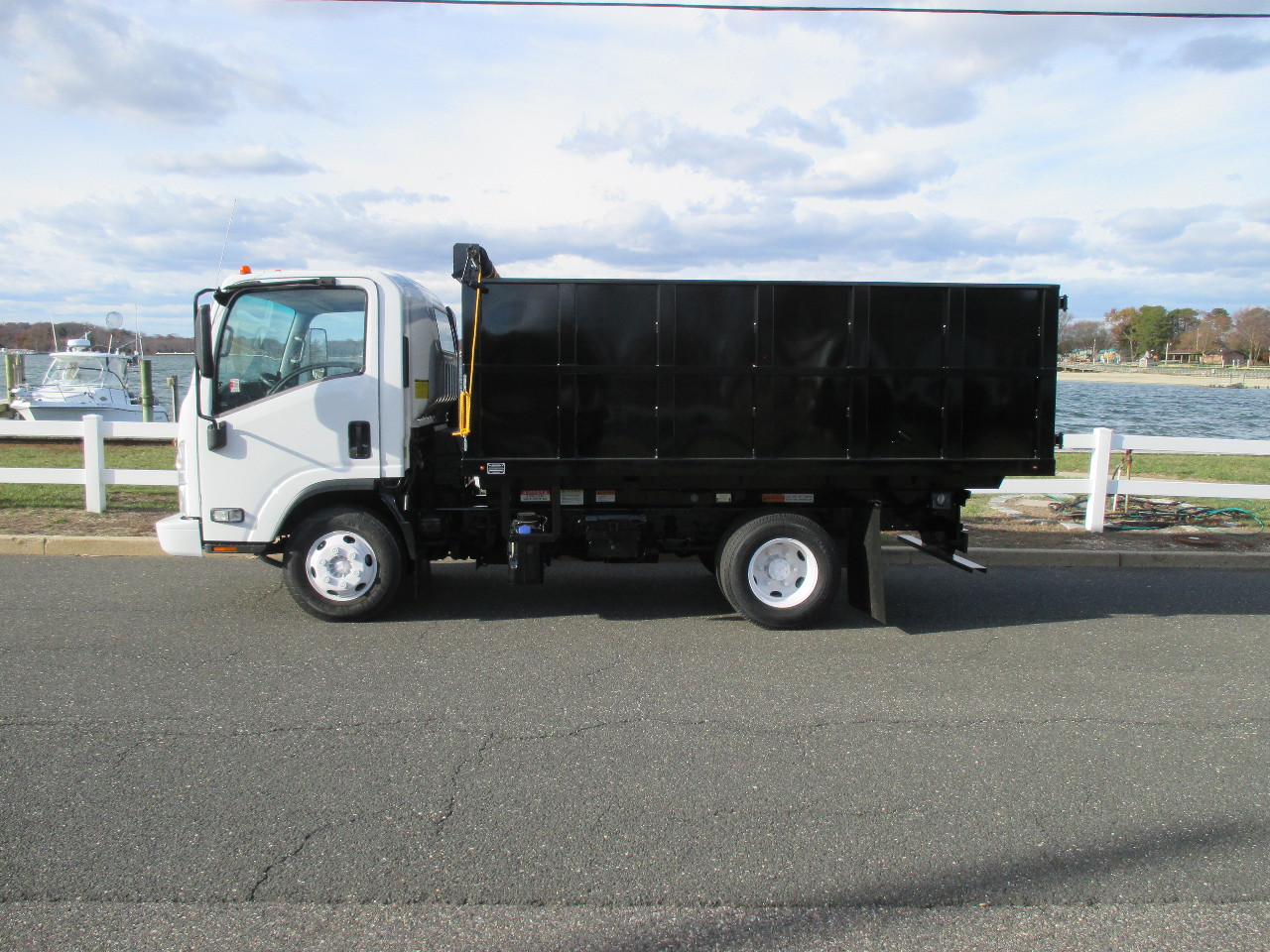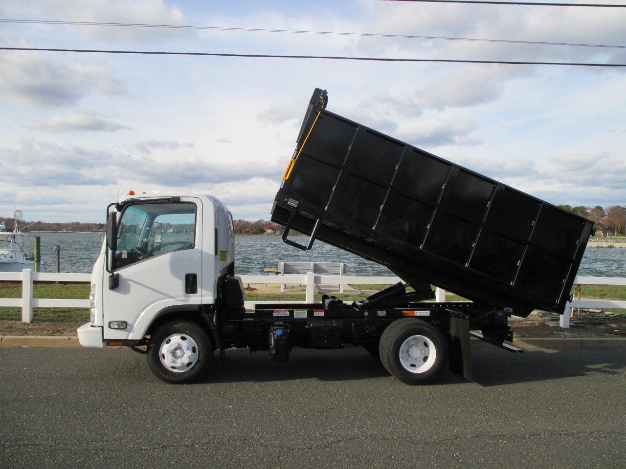 STOCK # 07453 2016 ISUZU NPR, AUTO, NON CD, DIESEL, 12FT LANDSCAPE/TRASH DUMP TRUCK FOR SALE 4 CYL DIESEL (73,275 MILES), AUTO TRANS, 14,500 GVW, DISC BRAKES, 225/70R19.5 TIRES, BRAND NEW 12'L X 96"W DUMP BODY W/ 42" SIDES & BARN STYLE REAR DOORS, CHAMPION ELECTRIC/HYDRAULIC HOIST W/ PUSH BUTTON CONTROLS, 1/2 STEEL TOW PLATE FOR FUTUTE PINTLE HITCH, MANUAL TARP, LED LIGHTS, LADDER, NEWER WHITE PAINT