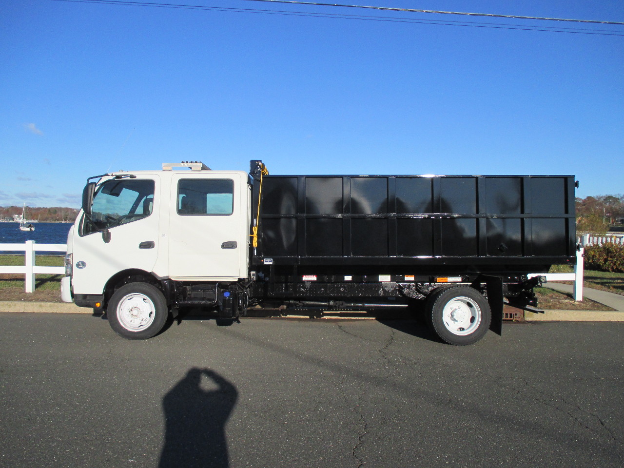 STOCK # 07448 2017 HINO 195 CREW CAB, AUTO, NON CD, DIESEL, 4 DOOR CREW CAB DUMP TRUCK FOR SALE 4 CYL DIESEL (116,645 MILES), AUTO TRANS, 19,500 GVW, DISC BRAKES, 225/70R19.5 TIRES, BRAND NEW 14'L X 96"W DUMP BODY W/ 42" SIDES & BARN STYLE REAR DOORS, 50"W CURBSIDE SWING DOOR, CHAMPION ELECTRIC/HYDRAULIC HOIST W/ PUSH BUTTON CONTROLS, 1/2 STEEL TOW PLATE FOR FUTUTE PINTLE HITCH, MANUAL TARP, LED LIGHTS, LADDER